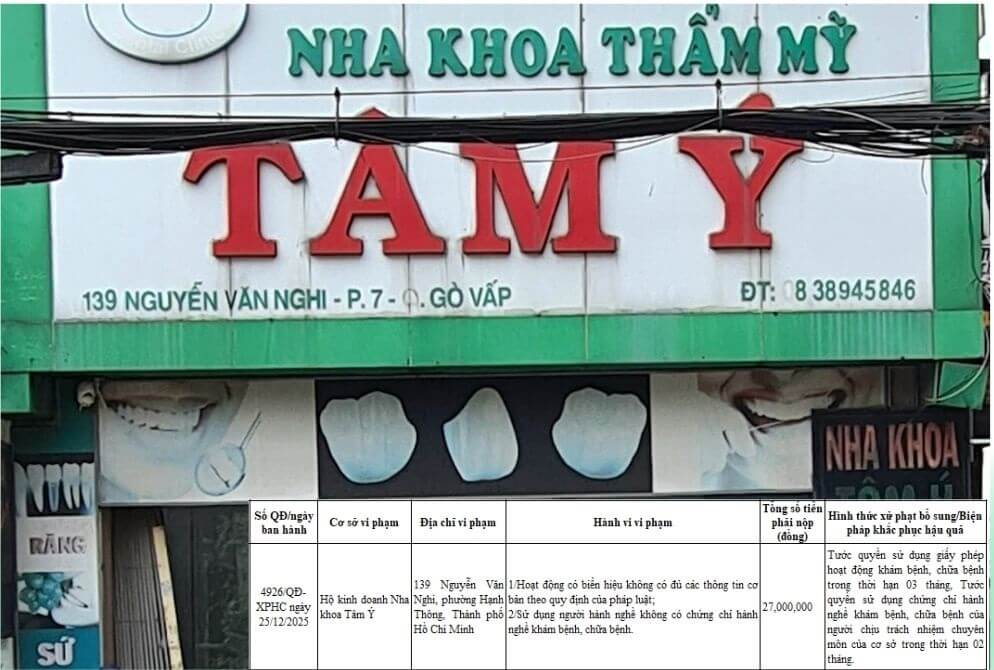 Dựa trên Quyết định số 4926/QĐ-XPHC ban hành ngày 25/12/2025, cơ quan chức năng đã chỉ rõ các sai phạm tại Hộ kinh doanh Nha khoa Tâm Ý.