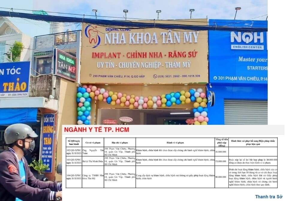 Ngày 3/4, Thanh tra Sở Y tế TP.HCM chính thức công bố quyết định xử phạt Nha khoa Tân Mỹ (địa chỉ: 299 Phạm Văn Chiêu, phường 14, quận Gò Vấp) vì hành vi cung cấp dịch vụ khám chữa bệnh không có giấy phép hoạt động.