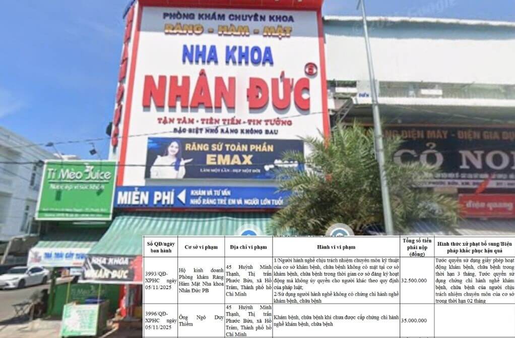 Ngày 05/11/2025, Phòng Kiểm tra – Pháp chế, Sở Y tế TP.HCM đã ban hành Quyết định xử phạt hành chính số 3993/QĐ-XPHC đối với Hộ kinh doanh Phòng khám Răng Hàm Mặt – Nha khoa Nhân Đức PB, có địa chỉ tại 45 Huỳnh Minh Thạnh, Thị trấn Phước Bửu, xã Hòa Hiệp, TP.HCM (nay thuộc địa giới hành chính mới sau sáp nhập).