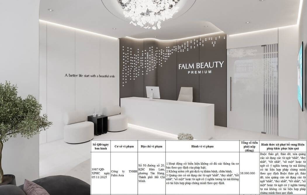 Ngày 05/11/2025, Phòng Kiểm tra – Pháp chếSở Y tế TP.HCM đã ban hành Quyết định xử phạt vi phạm hành chính số 3987/QĐ-XPHC đối với Falm Beauty Premium thuộc Công ty TNHH Falm Asia, là Phòng khám chuyên khoa Thẩm mỹ (địa chỉ: Số 50 đường số 20, Khu dân cư Him Lam, phường Tân Hưng, TP.HCM).